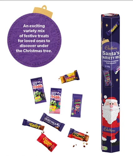 Indulge in the joy of Cadburys iconic chocolate bars and bites as you unwrap the excitement of Santas Variety Mix. With a delightful selection that includes CADBURY DAIRY MILK STRAWBERRY FREDDO, CADBURY DAIRY MILK FREDDO, PICNIC, CHERRY RIPE, CRUNCHIE, TWIRL, MARVELLOUS CREATIONS, CADBURY DAIRY MILK, and MAGICAL ELVES, each bite is a journey of sensory delight. Experience the smoothness of creamy milk chocolate, the crunch of nuts, the burst of fruity goodness, and the magical surprises hidden within.