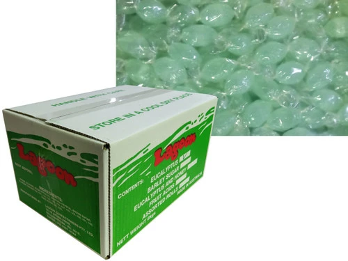 Eucalyptus Lollies – these pale green hard candy lollies have that great Aussie eucalyptus taste. Individually wrapped pieces. (8kg box)