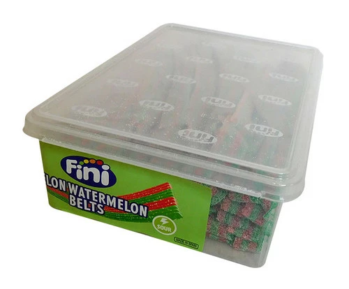 Fini Melon / Watermelon Belts. These sugar dusted jelly belts (straps) are striped in bright colours and taste great too. (150 belts in a re-sealable display)