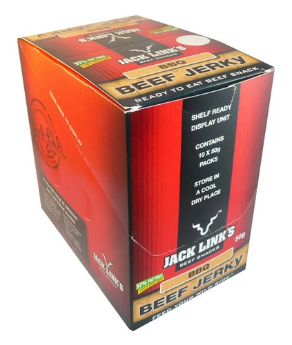 Genuine and delicious Jack Links Beef Jerky – BBQ flavour. Premium cuts of meat, perfectly seasoned and smoked for the subtle smoky flavor you expect in authentic jerky. Naturally delicious. (10 x 50g Beef jerky packs in a display unit)