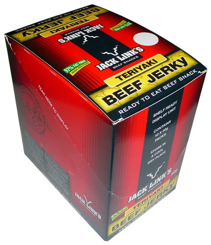 Genuine and delicious Jack Links Beef Jerky – Teriyaki flavour. Premium cuts of meat, perfectly seasoned and smoked for the subtle smoky flavor you expect in authentic jerky. Naturally delicious. (10 x 50g Beef jerky packs in a display unit)