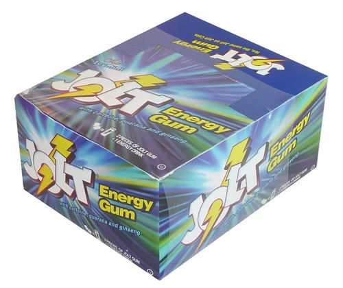 Jolt Energy Gum – icy mint flavoured gum with caffeine, guarana and ginseng. Two pieces of Jolt gum is the equivalent of one energy drink. (12 packs in a display unit)